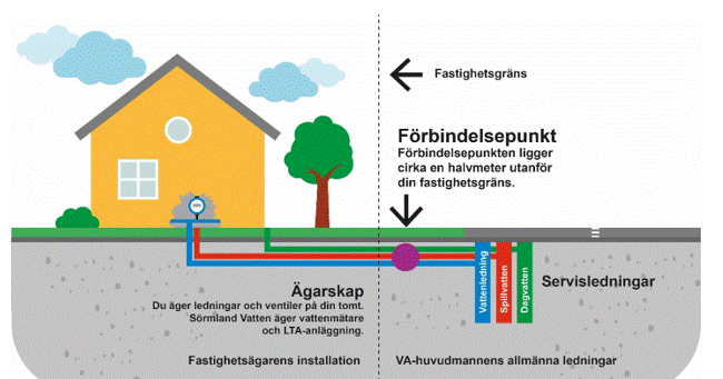 Slutligen vill vi även hänvisa till bifogad illustration nedan, där ansvarsfördelningen mellan fastighetsägare och VA-huvudman tydligt framgår – från huset och ut till den gemensamma förbindelsepunkten. Fastighetsägaren ansvarar för alla installationer på egen fastighet, medan VA-huvudmannen har ansvar för de allmänna ledningarna utanför förbindelsepunkten.