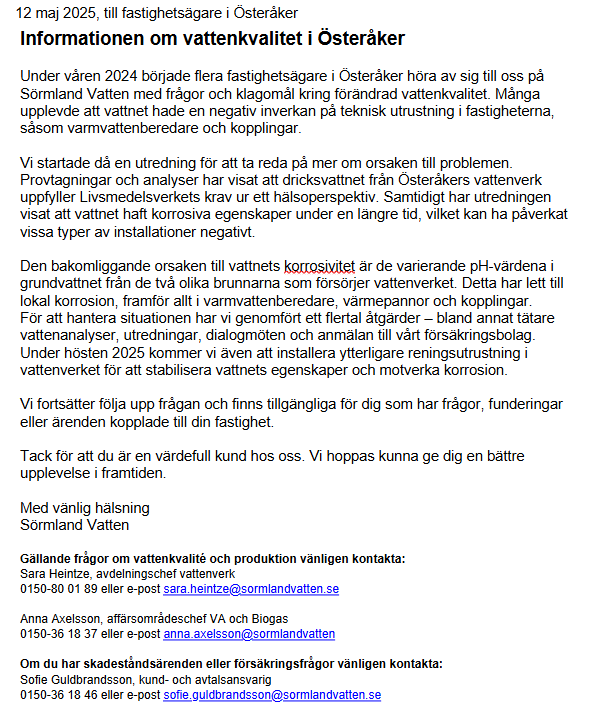 Tack till fastighetsägare som har hört av sig under våren 2024 för att berätta om förändrad vattenkvalitet i Österåker. Vi värdesätter att ni har tagit er tid att dela detta med oss.
